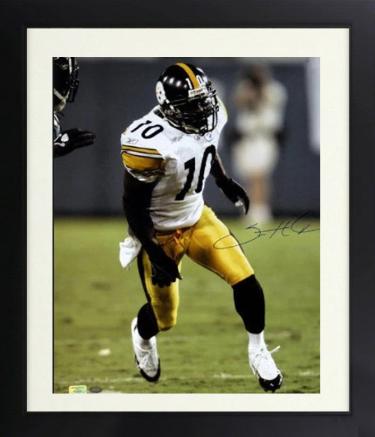 In Super Bowl XLIII, Holmes secured the Steelers' NFL-record 6th Super Bowl win after catching a 6-yard touchdown pass from Ben Roethlisberger with 35 seconds left in regulation. Holmes caught nine passes for 131 yards and a touchdown, including four receptions for 71 yards on their final game-winning drive. He was named Super Bowl MVP, becoming the sixth wide receiver to win the award. Santonio Holmes has hand autographed this Pittsburgh Steelers 16x20 Photo. New, Custom Black Frame with White Mat. Holmes Hologram and Certificate of Authenticity from Athlon Sports.