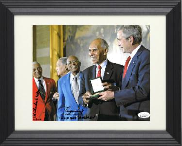 Charles E. McGee is a retired African-American fighter pilot who was one of the Tuskegee Airmen and a career officer in the United States Air Force for 30 years who flew a total of 409 combat missions in World War II, Korea and Vietnam. Charles E. McGee has hand signed this 8x10 Photo with 2007 Congressional Gold Medal Tuskegee Airmen inscription. New, Custom Black Frame with White Mat. JSA Authentication #AC92642 & JSA Certificate of Authenticity