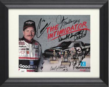 Dale Earnhardt Sr. was an American professional stock car driver and team owner, who raced from 1975 to 2001 in the former NASCAR Winston Cup Series (now called the NASCAR Cup Series), most notably driving the No. 3 Chevrolet for Richard Childress Racing. This Intimidator 8x10 Photo has been hand signed by 6 of the Richard Childress Pit Crew including- Danny Chocolate Myers/David Smith/Kirk Shelmerdine/Cecil Gordon/Will Lind & John Mulloy. New, Custom Black Frame with White Mat. JSA Authentication #AC92846 and JSA Certificate of Authenticity