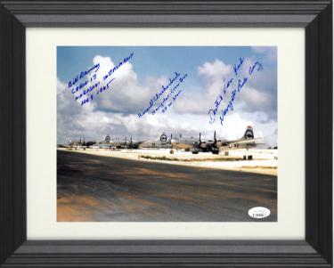 | Theodore "Dutch" Van Kirk was a navigator in the United States Army Air Forces, best known as the navigator of the Enola Gay when it dropped the first atomic bomb on Hiroshima. Russell Gackenbach served as a 2nd Lieutenant in the 393rd Bombardment Squadron and in the 509th Composite Group. He flew in the Necessary Evil during the August 1945 Hiroshima bombing mission and in the Enola Gay during the Nagasaki bombing mission. On August 6, 1945 Gackenbach was a navigator aboard Necessary Evil, one of two B-29’s that accompanied the Enola Gay. Crew member for the Nagasaki Mission was Bill Barney.  Dutch Van Kirk/Russell Gackenbach & Bill Barney have all three hand signed this 8x10 Photo with Navigator Enola Gay/Navigator- Crew B-10 Up and Atom and Crew 13 Nagasaki Instrument Aug 9, 1945 inscriptions. New, Custom Black Frame with White Mat.  JSA Hologram #EE63508 and JSA Certificate of Authenticity |