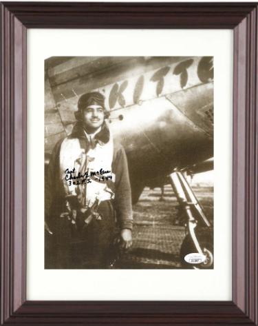 | Charles E. McGee is a retired African-American fighter pilot who was one of the Tuskegee Airmen and a career officer in the United States Air Force for 30 years who flew a total of 409 combat missions in World War II, Korea and Vietnam.  Charles E. McGee has hand signed this 8x10 Photo with 302 F.S.- 1944 inscription. New, Custom Mahogany Frame with White Mat.  JSA Authentication Sticker & Certificate of Authenticity #II11097 |