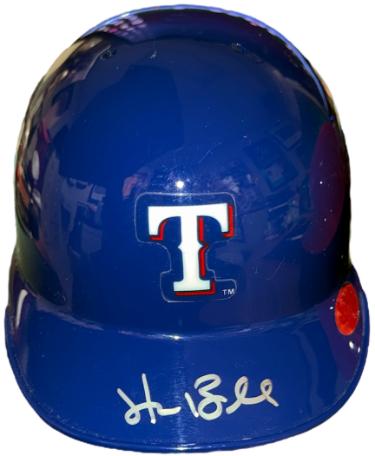 Hank Blalock has hand signed this Texas Rangers Riddell MLB Mini Batting Helmet