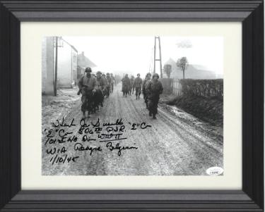 | Herb Suerth was part of the historic Band of brothers of WWII. When the original book was released in 1992, his exploits were not included. Perhaps that was because Suerth was a replacement, arriving in Easy Company just before the deployment to the Ardennes Forest and the Battle of the Bulge.  But when the screenplay evolved in 2000, his character made a brief appearance in the back of a truck carrying the men through the frozen night toward Bastogne. He was called by his nickname, “Junior.” Nor was his time in combat very long–about three weeks. In January 1945, he was terribly wounded by a German artillery shell fired at the flash of light from an unthinking soldier who lit a cigarette in the dark.  Herb "Jr" Suerth has hand signed this 8.5x11 Photo with "E" Co, 506th, PIR "E" Co, 101st A/B Div WWII and WIA Belgium 1/10/45 .  New, Custom Black Frame with White Mat. JSA Hologram #DD64293 and Certificate of Authenticity. |