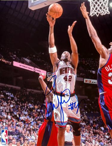 Lorenzen Wright was a pro basketball player for thirteen seasons in the NBA. He was drafted seventh overall in the 1996 NBA draft by the Los Angeles Clippers. Wright was recognized as a Third Team All-American by the Associated Press as a sophomore at Memphis. Lorenzen Wright has hand signed this Memphis Tigers 8x10 Photo (Clippers/Hawks/Grizlies) Bold Blue Full Pristine Signature with #42 inscription.Athlon Sports Collectibles Certificate of Authenticity. Image of actual item in stock - as shown