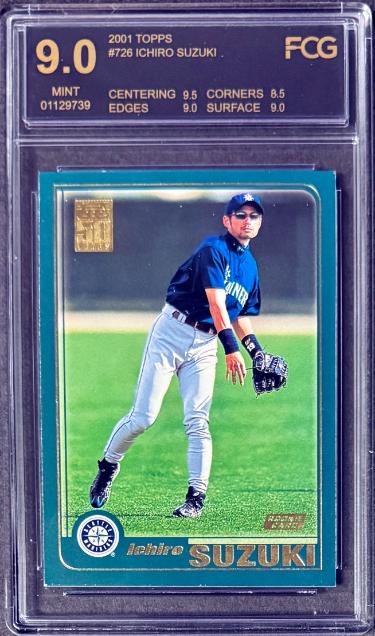 This is an Ichiro Suzuki 2001 Topps Rookie Card (RC) #726- FCG Graded 9 Mint (Seattle Mariners/HOF/with Sub Grades). Image of actual item in stock - as shown