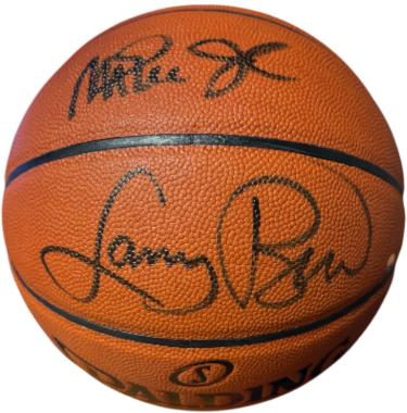 Magic Johnson was selected first overall in the 1979 NBA Draft by the Lakers. He won a championship and an NBA Finals Most Valuable Player Award in his rookie season, and won four more championships with the Lakers during the 1980s. Larry Bird was more than just "the hick from French Lick." During his 13 years as a Boston Celtic he was the 1980 Rookie of the Year, a 12-time NBA All-Star and scored more than 21,000 career points. In addition to leading the Green and White to three championships, Bird was co-captain of the first U.S.A. Dream Team and led them to Olympic gold in 1992. Magic Johnson and Larry Bird have hand signed this Spalding NBA Indoor Replica Game Basketball , Bold black full pristine Signatures. Steiner Sports Hologram and Steiner Certificate of Authenticity. Image of actual item in stock - as shown