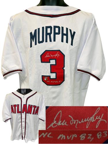 Dale Murphy played for the Atlanta Braves and won consecutive National League Most Valuable Player Awards in 1982 and 1983. He also won the National League's Silver Slugger Award four straight years (1982-1985), and the National League's Gold Glove award five straight years (1982-1986). This is a new, in stock, Dale Murphy signed Atlanta White Throwback Unlicensed Custom Stitched Baseball Jersey. Bold full Pristine signature with NL MVP 82, 83 inscription w/ fully stitched twill numbers on the front and back, there are NO LICENSED TEAM LOGOS, TAGS, BRAND NAMES or PATCHES ON THIS JERSEY & IS NOT AN AUTHENTIC OFFICIALLY LICENSED JERSEY, 100% polyester, made in the Philippines. Size XL (48/50). Schwartz Sports Hologram and Schwartz Certificate of Authenticity. Also includes Sports Memorabilia.com Hologram #T0039200. Image of actual item in stock - as shown