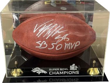 Von Miller is a pro football linebacker in the NFL. He was selected by the Denver Broncos with the second overall pick in the 2011 NFL draft. Miller has been a seven-time All-Pro selection and eight-time Pro Bowl selection. At the conclusion of the 2015 NFL season, he was named Super Bowl MVP in Super Bowl 50. Von Miller has hand signed this Official NFL New Duke SB 50 Logo Leather Football. Bold Silver Full Pristine Signature with Dual #58 & SB 50 MVP inscriptions. Deluxe Football Case with Custom Engraved SB 50 Champions Laser Etched Logo with Mirror Back. JSA Witnessed #WP48515 and JSA Certificate of Authenticity. Image of actual item in stock - as shown