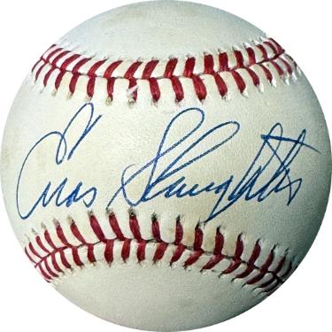 Immediately upon his return from the service in 1946, Enos Slaughter led the National League with 130 RBI and led the Cardinals to a World Series win over the Boston Red Sox. In the decisive seventh game of that series, Slaughter, running with the pitch, made a famous "Mad Dash" for home from first base on Harry Walker's single in the eighth inning, scoring the winning run after a delayed relay throw. This play was named #10 on the Sporting News list of Baseball's 25 Greatest Moments in 2001. Enos Slaughter has hand signed this RONL Rawlings Official National League Baseball (William White). Bold Blue Sweet Spot signature, ball is toned as shown, sold as is. Athlon Sports Collectibles Certificate of Authenticity. Image of actual item in stock - as shown
