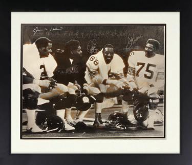 The Steel Curtain was the nickname given to the front four of the famous defensive line of the Pittsburgh Steelers during their 1970s dynasty years. This defense was the backbone of the Steelers dynasty, which won 4 Super Bowls (IX, X, XIII, and XIV). This is a hand autographed Pittsburgh Steelers Steel Curtain B&W Chromium 16x20 Photo. 4 Autographs include: Joe Greene, Dwight White (deceased), Ernie Holmes (deceased), and LC Greenwood (deceased). Bold Silver Full Signatures. New, Custom Black Frame with White Mat. Beckett Authentication Signature Review Order ID #97419 and Review Order Item ID #117500. Also includes Hot Corner Sports Inc. Certificate of Authenticity from the original signing. Image of actual item in stock - as shown