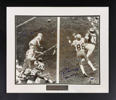 Perhaps Roger Staubach's most famous moment was the "Hail Mary pass" in the 1975 playoff game against the Minnesota Vikings. With seconds on the clock and the Cowboys trailing 14–10, Staubach launched a 50-yard bomb to wide receiver Drew Pearson, who caught the pass and strode into the end zone for a 17–14 victory. After the game, Staubach said he threw the ball and said a "Hail Mary". Since then, any last-second pass to the end zone in a desperate attempt to score a game-winning or tying touchdown is referred to as a "Hail Mary" pass. Roger Staubach and Drew Pearson have both hand signed this 1975 Dallas Cowboys 16x20 Photo. Bold blue full pristine signatures with Drew adding the inscription Hail Mary inscription. New, Custom Black Frame with White Mat and Custom Hail Mary Nameplate. Limited Edition 1146/1975. Steiner Sports Hologram and Steiner Sports Certificate of Authenticity. Image of actual item in stock - as shown