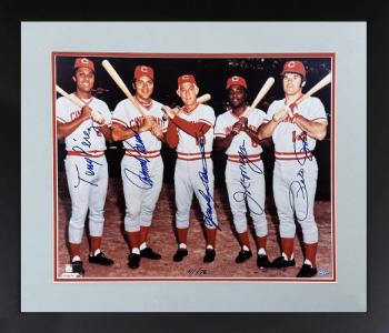 The "Big Red Machine" was a nickname for the dominant Cincinnati Reds baseball team of the 1970s, known for winning two World Series in 1975 and 1976. The team featured a lineup of Hall of Fame players and other stars like Johnny Bench, Pete Rose, and Joe Morgan, and is considered one of the greatest dynasties in baseball history. This is a Big Red Machine Multi Signed 16x20. Four hand signed signatures include: Pete Rose/Tony Perez/Joe Morgan/ Johnny Bench. Mounted Memories Hologram and . New, Custom Black Frame with Custom Gray/Red Double Mats. Certificate of Authenticity from Athlon Sports Collectibles. Image of actual item in stock - as shown.