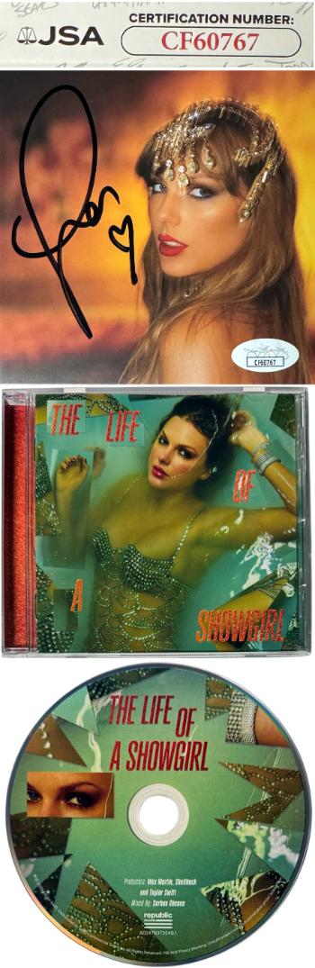The Life of a Showgirl is the twelfth studio album by the American singer-songwriter Taylor Swift. It was released on October 3, 2025, through Republic Records. Swift recorded it in Sweden with the producers Max Martin and Shellback, during the European leg of the Eras Tour in 2024. This is a Taylor Swift 2025 The Life of a Showgirl CD With a Hand Signed 4.75 Inch X 4.75 Inch Photo Art Card #1 Image. Bold black pristine signature with Heart, as shown. JSA Authentication #CF60767 & JSA/CGC Certificate of Authenticity. 12 Tracks-Jewel case with collectible front and back cover art- 1 disc with collectible disc artwork- A collectible 8-page booklet that includes never-before-seen photos and song lyrics