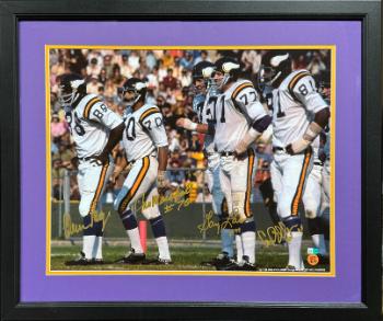 The Purple People Eaters was the nickname of the Minnesota Vikings football team's defensive line of the late 1960s to the late 1970s, when they played in four Super Bowls. The Purple People Eaters are Alan Page (9 Pro Bowl Selections/NFL MVP/Hall of Famer), Carl Eller (6 Pro Bowl Selections/Hall of Famer), Jim Marshall (2 Pro Bowl Selections), and Gary Larsen (2 Pro Bowl Selections) The Purple People Eaters were a big factor in the post-season success of the Vikings from the late 1960s through the 1970s. This Minnesota Vikings 16X20 photo was hand signed by the Purple People Eaters: Carl Eller with HOF insc, Alan Page, Jim Marshall, and Gary Larsen. Bold Gold Full Signature, with Custom Purple/Gold Double Mat & New Black Framing. Purple People Eaters Hologram and Sports Memorabilia.com Hologram #T0058737 & COA. Image of actual item in stock - as shown