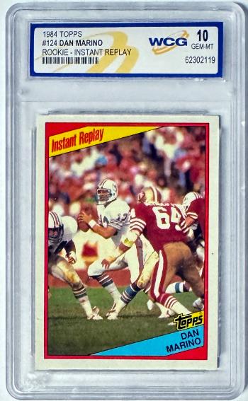 This is a Dan Marino 1984 Topps Instant Replay Rookie Card (RC) #124- WCG Graded 10 Gem Mint (Miami Dolphins/HOF). Image of actual item in stock - as shown