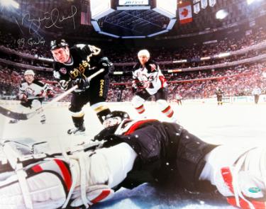 Brett Hull played for the Calgary Flames, St. Louis Blues, Dallas Stars, Detroit Red Wings and Phoenix Coyotes between 1986 and 2005. His career total of 741 goals is the third highest in NHL history, and he is one of five players to score 50 goals in 50 games. He was a member of two Stanley Cup winning teams. He was named a first team all-star on three occasions and played in eight NHL All-Star Games. Brett Hull has hand signed this Dallas Stars NHL Licensed 16x20 Photo. Bold Silver Full Signature with 99 GWG inscription. Minor dings, from signing & handling, sold as is.