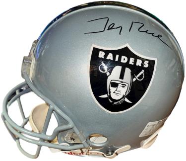 Jerry Rice is an American former professional football wide receiver who played for 20 seasons in the National Football League (NFL). He won three Super Bowl titles with the San Francisco 49ers before two shorter stints at the end of his career with the Oakland Raiders and Seattle Seahawks. For his accomplishments and numerous records, Rice is widely regarded as the greatest wide receiver of all time and one of the greatest players in NFL history. Jerry Rice Has Hand Signed This Oakland Raiders Riddell TB NFL Authentic Proline Full Size Helmet. Bold black full Pristine signature left side. Steiner Hologram and Beckett Authentication Services Signature Review Order ID : 97572, Order Item ID #117672.