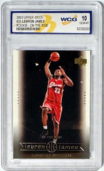 This is a LeBron James 2003 Upper Deck On the Rise Rookie Card (RC) #25- WCG Graded 10 Gem Mint (Cleveland Cavaliers). Image of actual item in stock - as shown