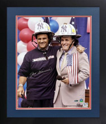 Joe Torre's connection to 9/11 is primarily through his role as the manager of the New York Yankees and his involvement in the city's healing process following the attacks. He and his team became a symbol of the city's resilience and played a significant role in its emotional recovery. He and his players visited hospitals and the armory, where they met with families grieving the loss of loved ones. The Yankees resumed playing, and the team's performance in the postseason was a source of national pride and a step towards healing. Joe Torre is pictured with Rudy Giuliani who was praised for his leadership in the aftermath of the September 11 terrorist attacks in 2001. Joe Torre has hand signed this MLB Licensed 16x20 Photo (with NY Mayor Rudy Giuliani after 9/11, World Trade Center) Bold Silver Full Pristine Signature. New Black Framing with Custom Blue/Red Matting. Steiner Sports Hologram and Steiner Certificate of Authenticity. Image of actual item in stock - as shown