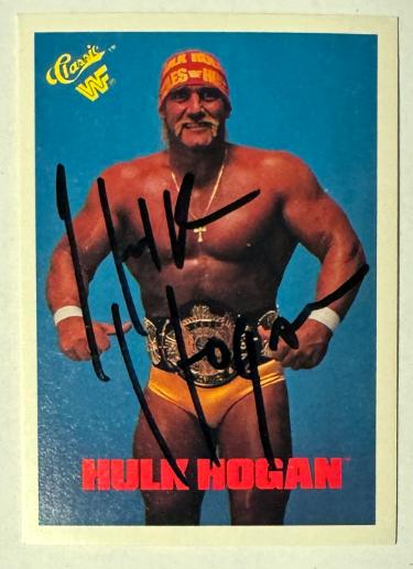 This is a Hulk Hogan signed 1989 Classic WWF On Card Auto #1- Hogan Hologram