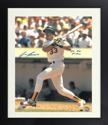 In 1985, Jose Canseco won the Baseball America Minor League Player of the Year Award, and was a late season call-up for the Oakland A's, playing in 29 games in the major leagues in 1985. He gained notoriety in 1986, his first full season, being named the American League's Rookie of the Year, with 33 home runs and 117 runs batted in. In 1988, Canseco became the first player in major league history to hit at least 40 home runs and steal at least 40 bases in the same year, by hitting 42 home runs and stealing 40 bases. Jose Canseco has hand signed this Oakland A's MLB Licensed 16x20 Photo with 86 ROY & 88 MVP inscriptions. New, Custom Black Frame with White Mat. Leaf Authentics Hologram and Certificate of Authenticity from Athlon Sports.