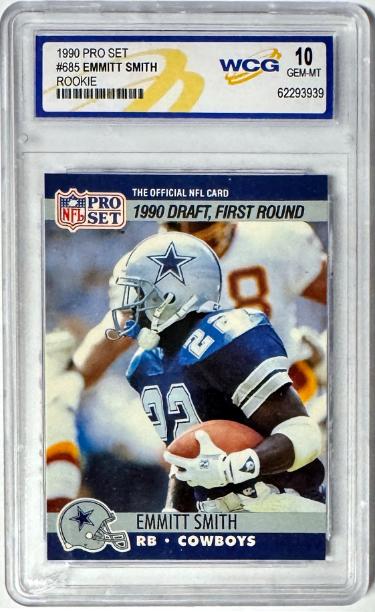 This is an Emmitt Smith 1990 Pro Set Rookie Card (RC) #685- WCG Graded 10 Gem Mint (Dallas Cowboys/HOF). Image of actual item in stock - as shown