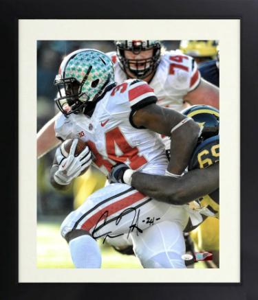 Carlos Hyde enrolled at Ohio State in January 2010. Hyde played primarily as a backup running back in his first two seasons before breaking out in his junior season with 970 yards and 16 rushing touchdowns in less than 10 games after missing two because of an ankle issue. He was named second-team all-Big Ten that year. On October 5, Hyde ran for his 1st 100 yard and multi-touchdown game of the season when he ran for 168 yards and 3 touchdowns when the Buckeyes played Northwestern. Carlos ran for a season high of 246 yards and 4 touchdowns against Illinois on November 16. He was a first-team All-Big Ten selection, and a third-team All-American by the Associated Press. Carlos Hyde has hand signed this Ohio State Buckeyes NCAA Licensed 16x20 Photo #34. New, Custom Black Frame with White Mat. JSA Authentication Sticker & JSA Certificate of Authenticity