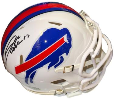 Josh Allen is the quarterback for the Buffalo Bills. Allen had a breakout season in 2020 when he led the Bills to their first division title and playoff victory since 1995 en route to an AFC Championship Game appearance. He also set the Bills franchise records for single-season passing yards and touchdowns, while earning Pro Bowl and second-team All-Pro honors. Allen brought the Bills to a consecutive division title the following year, the franchise's first since 1991, and became the first NFL quarterback to have a touchdown-scoring drive on every offensive possession of a game. Josh Allen has hand signed this Buffalo Bills NFL Riddell Speed Mini Helmet. Bold Black Full Pristine Signature with #17 inscription. Fanatics Hologram #A682305 & Fanatics Certificate of Authenticity. Image of actual item in stock - as shown