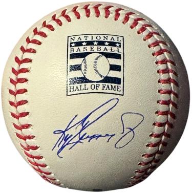 Ken Griffey, Jr. played 22 years in MLB for three teams, from 1989–2010. He spent most of his career with the Mariners and Reds. A 13-time All-Star, Griffey was one of the most prolific home run hitters in baseball history; his 630 home runs rank as the sixth-most in MLB history. He won 10 Gold Glove Awards and was elected to the 2016 Baseball Hall of Fame, receiving a record 99.32% of the vote. Ken Griffey, Jr. has hand autographed this Official Rawlings Hall of Fame Logo MLB Baseball. Bold Blue Full Pristine Signature under HOF logo. Tri-Star Hologram #7795686 and Tri-Star Hologram. Image of actual item in stock - as shown.