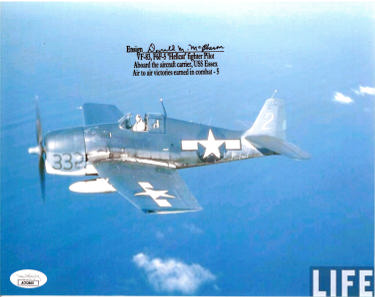 Donald McPherson was awarded the Distinguished Flying Cross for extraordinary achievement while participating in aerial flight while serving as a Fighter Pilot in Fighting Squadron EIGHTY-THREE (VF-83), in action against enemy Japanese forces in the Pacific Ocean Area during World War II. Donald McPherson has hand signed this Vintage Color 8x10 Photo. JSA Authentication #AC92660 and JSA Certificate of Authenticity.