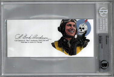 Clarence Emil "Bud" Anderson is a retired officer in the United States Air Force, a triple ace of World War II, and the highest scoring living American fighter ace. During the war he was the highest scoring flying ace in his P-51 Mustang squadron. Towards the end of Anderson's two combat tours in Europe in 1944 he was promoted to major at 22, a young age even for a highly effective officer in wartime. Col CE “Bud” Anderson signed 3”x6.5” cut signature w/ Image. BAS/Beckett Encapsulated #00012556891