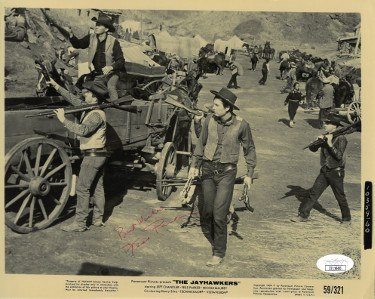 Fess Parker was an American film and television actor best known for his portrayals of Davy Crockett in the Walt Disney 1954–1955 TV miniseries, which aired on ABC, and as Daniel Boone in an NBC television series from 1964 to 1970. The Jayhawkers! is a 1959 American Technicolor VistaVision film directed by Melvin Frank, starring Jeff Chandler as Luke Darcy and Fess Parker as Cam Bleeker. The film is set in pre-Civil War Kansas. Darcy leads a gang which seeks to take advantage of Bleeding Kansas. Fess Parker has hand autographed this The Jayhawkers Vintage B&W 8x10 Photo with Best Wishes inscription. JSA Authentication Sticker #II11660 & Certificate of Authenticity. Imperfections/bends on photo, sold as is, no returns.