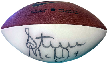 Steve McNair has Hand Signed this Nike Logo Full Size White Panel Football. Full black signature, inscribed 9, panel below Nike Logo. Beckett Authentication Signature Review Order ID : 71561, Order Item ID #86212.