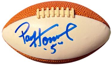 Paul Hornung was the first selection overall in the 1957 NFL Draft by the Green Bay Packers, with whom he would go on to win four league championships, including the first ever Super Bowl in January 1967. Considered by many to be the best short-yardage runner to ever play the game, Hornung was twice voted the league’s MVP and was chosen as an All-Pro twice and named to the Pro Bowl twice. He is one of only five players to have won both the Heisman Trophy and the NFL's Most Valuable Player Award. Paul Hornung has Hand Signed this Plastic Mini Football (5.5 inch)