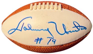 Johnny Unitas has Hand Signed this Plastic Mini Football (5.5 inch). Bold blue full pristine signature with #19 inscription. Very Minor Storage Spots, sold as is. Athlon Sports Collectibles Certificate of Authenticity. Image of actual item in stock - as shown