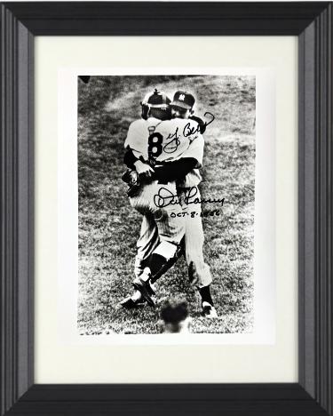 Don Larsen's most notable accomplishment was pitching the only perfect game (as well as the only no hitter) in the history of the World Series. He was pitching for the New York Yankees in Game 5 of the 1956 World Series against the Brooklyn Dodgers, on October 8, 1956. His perfect game remains the only no-hitter of any type ever pitched in postseason play. Known as much for his catching abilities as his "Yogi-isms," Yogi Berra played on 10 World Series championship teams and appeared in 14 World Series with the New York Yankees. He called three no-hitters, one of them Don Larsen's perfect game in the 1956 World Series. Don Larsen & Yogi Berra have both signed this New York Yankees Perfect Game 8x10 Photo. Bold Black dual Pristine signatures and Larsen inscribed OCT 8 1956. Photo has very minor dings, from signing, sold as is. New, Custom Black Frame with White Mat. Athlon Sports Collectibles Certificate of Authenticity and LTD Enterprises Yogi Berra Family Museum Purchase Order Copy as shown. Image of actual item in stock - as shown