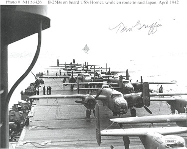 Tom Griffin was an American B-25 bomber navigator who survived the Doolittle Raid in 1942. Griffin attacked Tokyo along with 16 land-based bombers from an aircraft carrier, and later parachuted over China. After relocating to North Africa, he was shot down during an air raid in 1943 and spent time in a prisoner-of-war camp until he was rescued in early 1945. Tom Griffin has hand signed this Vintage B&W 8x10 Photo. JSA Hologram #DD64466 and Certificate of Authenticity.