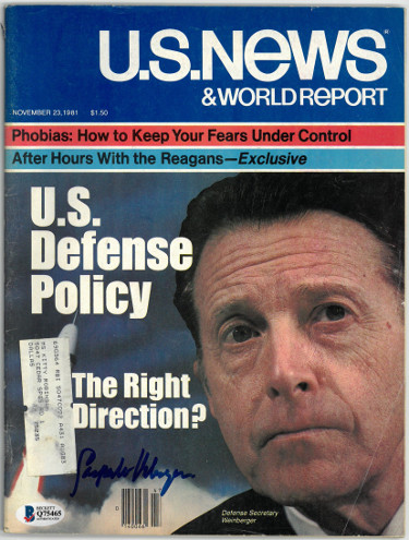 Most notably he was Secretary of Defense under President Ronald Reagan from 1981 to 1987. He was indicted in the Iran–Contra affair but never convicted. Weinberger was awarded both the Presidential Medal of Freedom in 1987 and an honorary British knighthood from Queen Elizabeth II. Caspar Weinberger has hand signed this U.S. News & World Report Full Magazine from November 23, 1981. Beckett/BAS Hologram #Q75465 and Beckett Certificate of Authenticity. Handling/condition as shown/ front cover crease in lower right.
