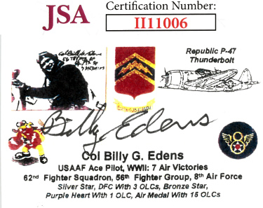 Billy Edens was assigned to fly the P-47 Thunderbolt in World War II with the 62nd Fighter Squadron of the famous 56th Figther Group at Royal Air Force Station Boxted, England. Edens made an immediate impression on the famed group as a result of his aggressiveness and natural ability, despite his relative inexperience. He became one of the few Second Lieutenants to become an “ace”, achieving the feet in only one month. Between 8 June and 7 July 1944, he achieved seven aerial victories. In addition to Edens’ aerial victories, he demonstrated an amazing determination to survive. In total, four of Edens aircraft were destroyed during World War II. Billy Edens has hand signed this 3.5x2.5 Cut Signature On Paper. JSA Authentication #II11006 and JSA Certificate of Authenticity. Image of actual item instock - as shown.
