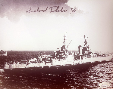 USS Indianapolis (CL/CA-35) served as the flagship for the commander of Scouting Force 1 for eight years in battles across the Central Pacific during World War II. In July 1945, Indianapolis completed a top-secret high-speed trip to deliver parts of the first nuclear weapon ever used in combat, to the United States Army Air Force Base on the island of Tinian. On 30 July, the ship was torpedoed by the Imperial Japanese Navy submarine I-58, and sank in 12 minutes. Of 1,195 crewmen aboard, approximately 300 went down with the ship. The remaining 890 faced exposure, dehydration, saltwater poisoning, and shark attacks while stranded in the open ocean with few lifeboats and almost no food or water. The Navy only learned of the sinking four days later, when survivors were spotted by the crew of a PV-1 Ventura on routine patrol. Only 316 survived. The sinking of Indianapolis resulted in the greatest single loss of life at sea, from a single ship, in the history of the US Navy. Richard Thelen has hand signed this 8x10 Photo. JSA Authentication #AC92704 & JSA Certificate of Authenticity. Imperfect with slightly light signature, as shown, sold as is, no returns.