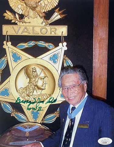 George Taro "Joe" Sakato has hand signed this 8x10 Photo with WWII inscription. JSA Authentication #AC92697 & JSA Certificate of Authenticity. Green Sharpie Signature.