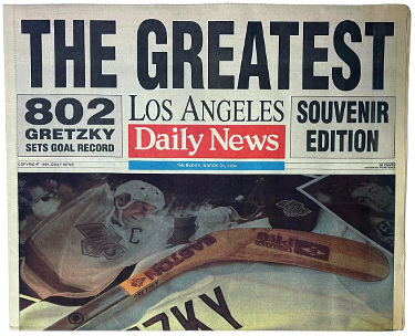 Wayne Gretzky is a Canadian former professional ice hockey player and former head coach. He played 20 seasons in the National Hockey League (NHL) for four teams from 1979 to 1999, retiring at the age of 38. Nicknamed "the Great One", he has been called the greatest ice hockey player ever by many sportswriters, players, NFL, etc. This is a Wayne Gretzky 802 Goal “The Greatest” Los Angeles Daily News March 31st 1994 Souvenir 8-page Edition. Minor imperfection on lower right corner , rest is like new, unread persevered vintage condition.