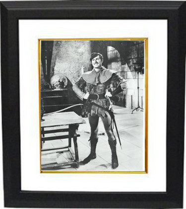Errol Flynn was an Australian-born American actor during the Golden Age of Hollywood. Considered the natural successor to Douglas Fairbanks, he achieved worldwide fame for his romantic swashbuckler roles in Hollywood films, as well as frequent partnerships with Olivia de Havilland. He was best-known for his role as Robin Hood in The Adventures of Robin Hood (1938); his portrayal of the character was named by the American Film Institute as the 18th greatest hero in American film history. This is a Errol Flynn unsigned B&W 8x10 Photo with Custom White Mat and Premium Black Frame.