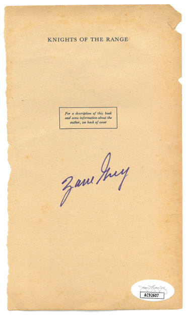 Pearl Zane Grey was an American dentist and author best known for his popular adventure novels and stories associated with the Western genre in literature and the arts; he idealized the American frontier. His novels and short stories have been adapted into 112 films, two television episodes, and a television series, Dick Powell's Zane Grey Theater. In the spirit and glory of a classic Western, and published exactly as the author originally intended, 1936 Knights of the Range, is one of Zane Grey’s swiftest and most exciting novels. Zane Grey has Hand Signed this 1936 Knights Of The Range Original Book 4x7 Page, Pristine full signature, amazing condition. JSA Authentication #AC92607 and JSA Certificate of Authenticity.