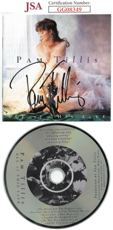 Pam Tillis is an American country music singer, songwriter, record producer, and actress. She is the daughter of country music singer Mel Tillis. She has won two major awards: a Grammy Award for Best Country Collaboration with Vocals in 1999 for the multi-artist collaboration "Same Old Train", and the 1994 Country Music Association award for Female Vocalist of the Year. In 2000, she was inducted into the Grand Ole Opry. Pam Tillis has hand signed this 1995 All Of This Love Album Cover Booklet w/ CD & Case. JSA Authentication #GG08349 and JSA Certificate of Authenticity. Handling/condition as shown.