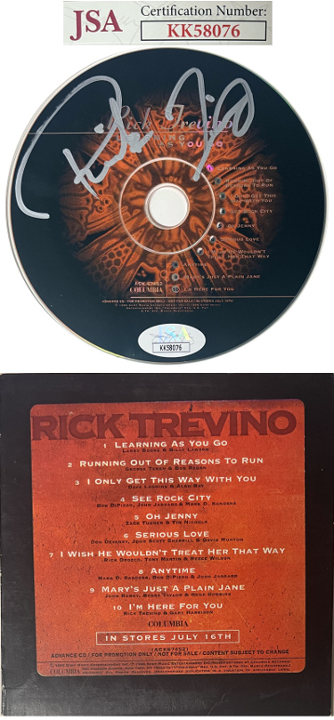 Rick Trevino is an American country music artist. Signed to Columbia Nashville in 1993, Trevino began his career that year with the release of his debut single "Just Enough Rope", the first mainstream country music single to feature separate English and Spanish versions. Trevino has charted a total of fourteen singles on the Billboard Hot Country Songs chart and recorded seven studio albums. His highest-charting single, "Running Out of Reasons to Run", reached No. 1 on that chart in 1996. Rick Trevino has hand signed this 1996 Learning As You Go Advance CD w/ Slip Case. Bold Silver Full Pristine on CD signature. JSA Authentication #KK58076 and JSA Certificate of Authenticity. Image of actual item in stock - as shown