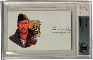 Lieutenant Colonel Edward Saylor served in the U.S. Air Force. He was a veteran of World War II and participated in the Doolittle Raid on Japan on April 18, 1942. Saylor was the flight engineer for Crew#15 of the Doolittle Raiders. Saylor was one of the last four surviving Doolittle Raiders at the time of his death in 2015. Edward Saylor has hand signed this 3”x5” cut signature w/ Image. BAS/Beckett Encapsulated #00012556890