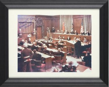 | Henry T. King Jr. was an attorney who served as a U.S. Prosecutor at the Nuremberg Trials in 1946-47. Late in his career, he became a law professor and an activist, writer, and lecturer working on international law and war crimes. David M. Crane has described King as "the George Washington of modern international law". Henry T. King Jr. has hand signed this 1946 WWll Nuremberg Trials Color 8x10 photo  w/ Nuremberg Trials Prosecutor inscription.  RARE signature. New, Custom Black Frame with White Mat. PSA Authentication Sticker # AD55351 and Certificate Of Authenticity from Athlon Sports Collectibles. |