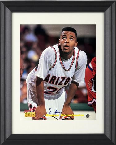 Damon Stoudamire was selected with the 7th overall pick by the Toronto Raptors in the 1995 NBA draft and won the 1995–96 NBA Rookie of the Year Award. He played collegiately at the University of Arizona, and professionally for the Raptors, Trail Blazers, Grizzlies and Spurs. Damon Stoudamire has hand signed this Signature Rookies 8x10 Photo. Bold Full Blue Pristine Signature. New, Custom Black Frame with White Mat. Signature Rookies Hologram and Certificate of Authenticity. Limited Edition #31 of 3000. Image of actual item in stock - as shown