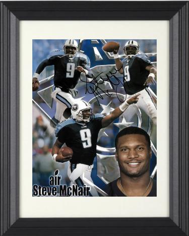| Stephen LaTreal McNair nicknamed "Air McNair", was an American football quarterback who played in the National Football League (NFL) for 13 seasons. He started his first two seasons with the Houston Oilers before the team relocated to Nashville, Tennessee. There, McNair would become the first franchise quarterback of the Tennessee Titans. He also played for two seasons with the Baltimore Ravens. Steve McNair Has Hand Signed This Tennessee Titans Air McNair NFL Collage 8x10 Photo #9. Bold full black pristine signature, Inscribed 9. New, Custom Black Frame with White Mat. Beckett Authentication Signature Review Order ID : 71616, Order Item ID #86283 |